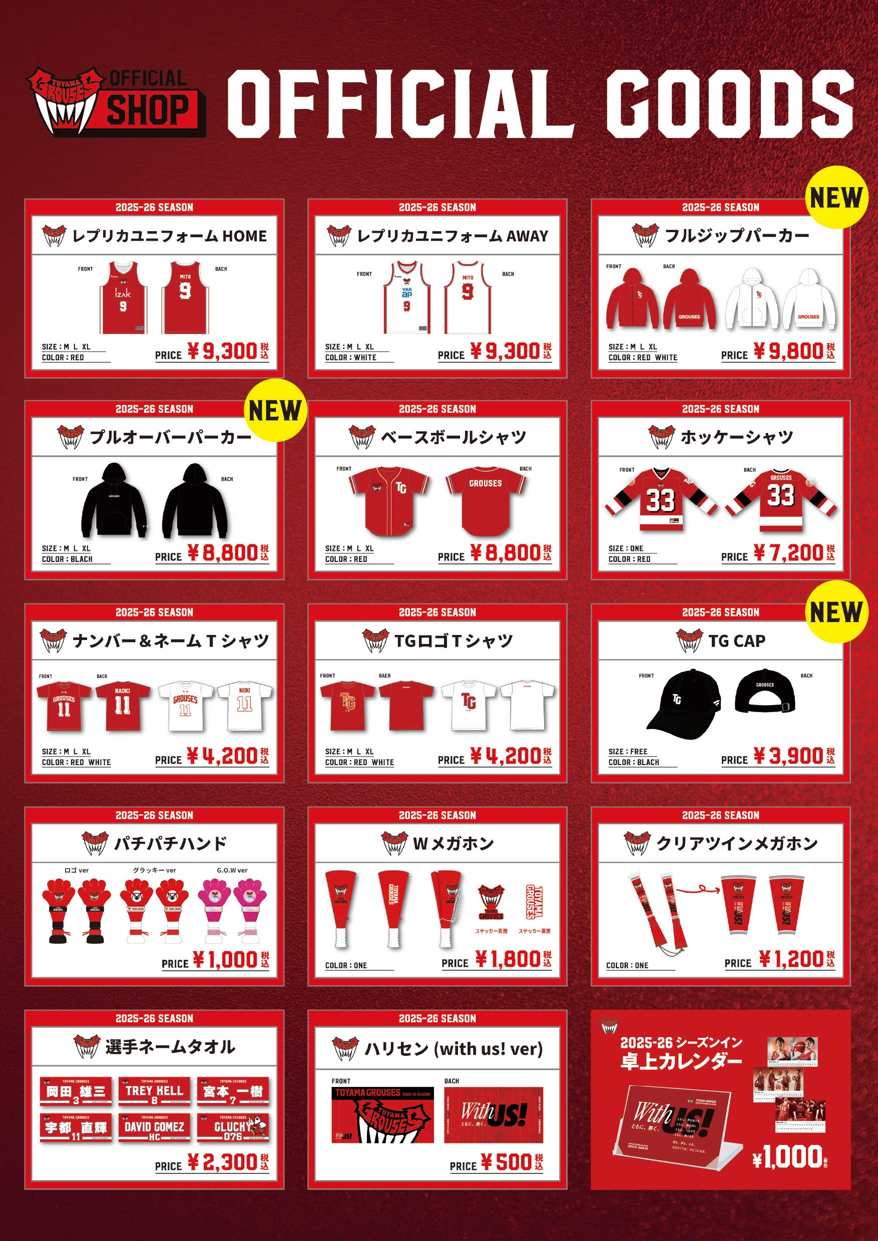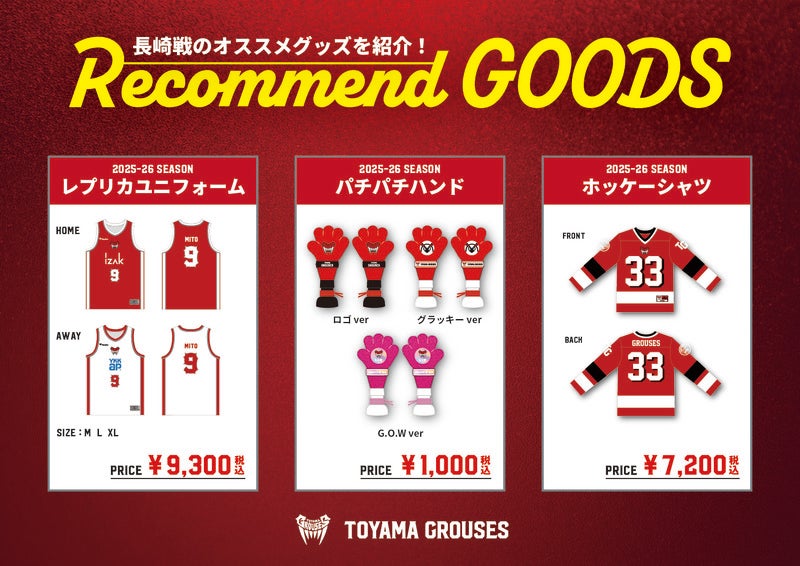 NEW OTHER 2025.10.24 【グッズ情報】長崎ヴェルカ戦 グッズ販売のお知らせ(10月25日・26日) いつも富山グラウジーズへの温かいご声援をいただき誠にありがとうございます。 10月25日(土)・26日(日)に富山県総合体育センターにて開催される長崎ヴェルカ戦にてグッズ販売を行います。 是非オフィシャルグッズショップにてお買い求めください! おすすめ商品 販売場所及び時間について 1階ロビーに設置し、25日(土)は12時00分、26日(日)は11時00分よりオープンとなります。観戦チケットをお持ちの方のみがオフィシャルグッズショップにご入店可能となりますので、あらかじめご了承ください。 レジでのご精算ついて 現金やPayPay、クレジットカードなど含むキャッシュレス決済も対応可能です。