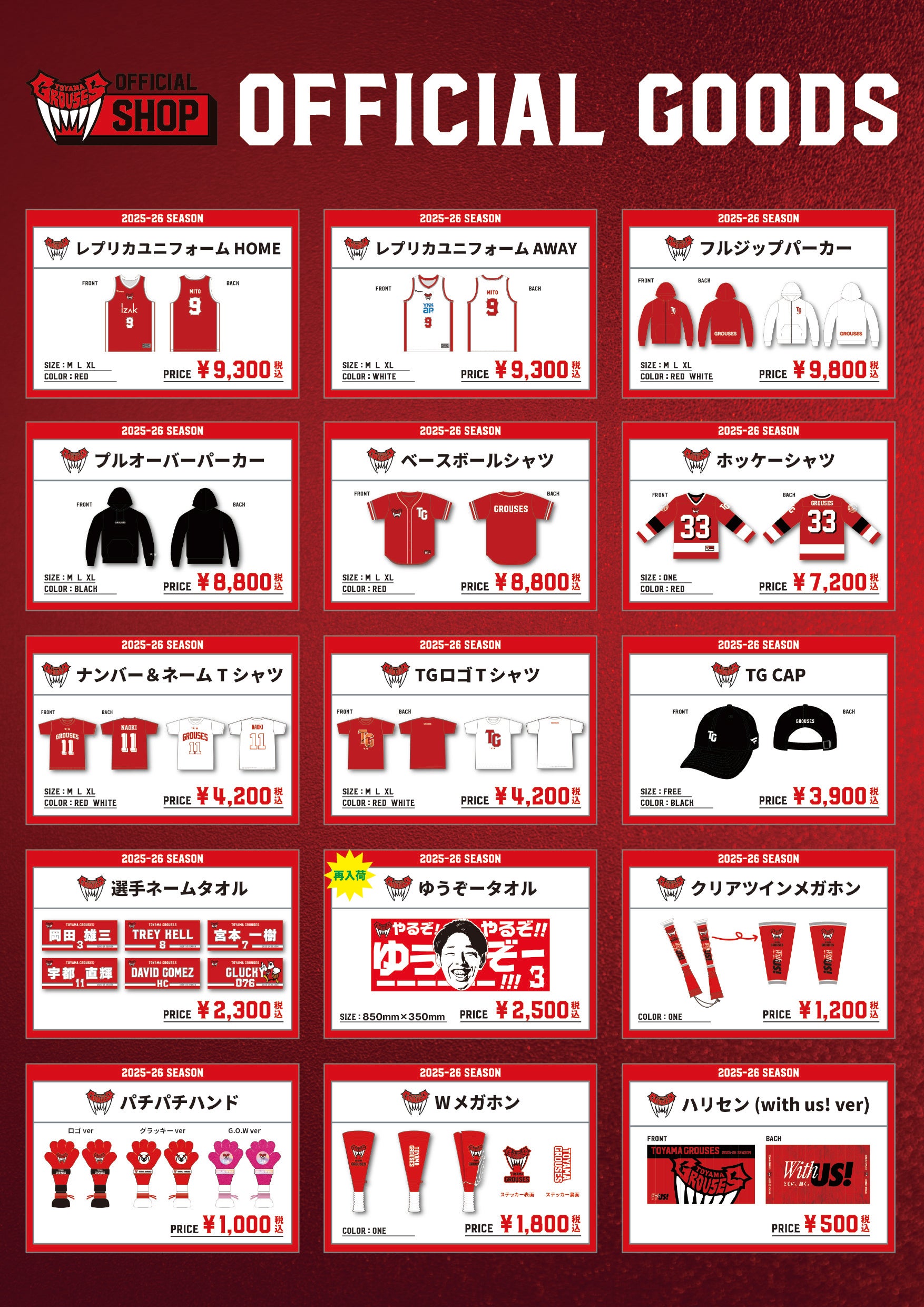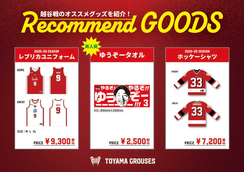 NEW OTHER 2025.10.28 【グッズ情報】越谷アルファーズ戦 グッズ販売のお知らせ(10月29日) いつも富山グラウジーズへの温かいご声援をいただき誠にありがとうございます。 10月29日(水)に富山県総合体育センターにて開催される越谷アルファーズ戦にてグッズ販売を行います。 是非オフィシャルグッズショップにてお買い求めください! おすすめ商品 販売場所及び時間について 1階ロビーに設置し、17時15分よりオープンとなります。観戦チケットをお持ちの方のみがオフィシャルグッズショップにご入店可能となりますので、あらかじめご了承ください。 レジでのご精算ついて 現金やPayPay、クレジットカードなど含むキャッシュレス決済も対応可能です。