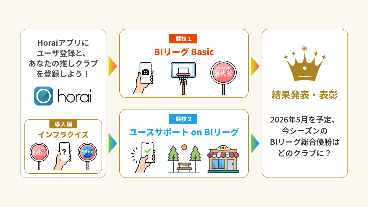 2026年2月22日(日)までの期間中、「BI リーグ Basic」と「ユースサポート on BI リーグ」イベントに参加が可能です。 参加すると参加賞として、B.LEAGUEカードがもらえます。また、ポイント数に応じて、選手サイン入りボールやグッズがもらえるかも!クラブ賞の表彰もありますので、沢山のご参加をお待ちしております。