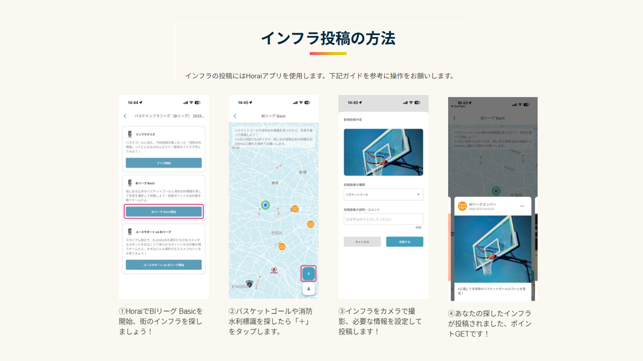 街にあるバスケットゴールと消防水利標識を探して撮影し、Horaiアプリから投稿してください。