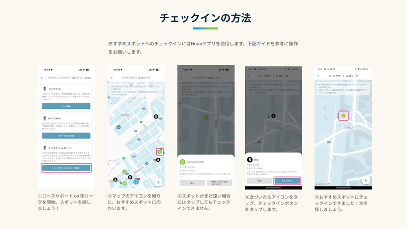チェックインすると①参加者、②「応援するクラブ」で登録したクラブ、③スポットを選定したクラブのそれぞれにポイントが加算されます。