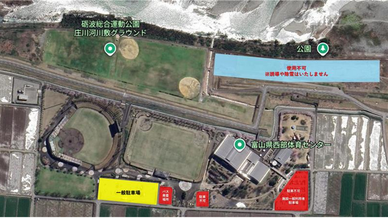 ※河川敷駐車場は、積雪時は雪捨て場となっております。除雪等や警備員による誘導はしない予定ですので、駐車される方は各自ご判断の上駐車してください。