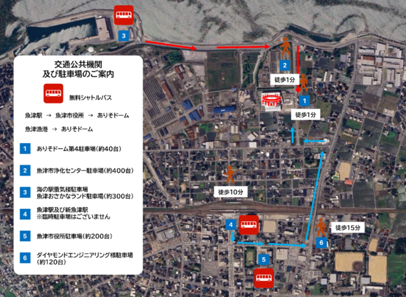 ④魚津駅→⑤魚津市役所→ありそドーム、③海の駅蜃気楼駐車場→ありそドームを繋ぐ、無料循環シャトルバスを運行いたします。是非ご利用ください。