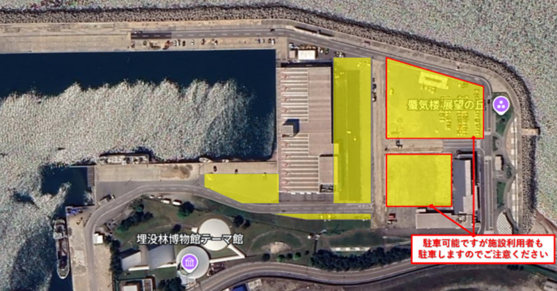 ※黄色のエリアが一般駐車場となります。お車でお越しの際は、警備員の指示に従い、駐車いただきますようお願いいたします。