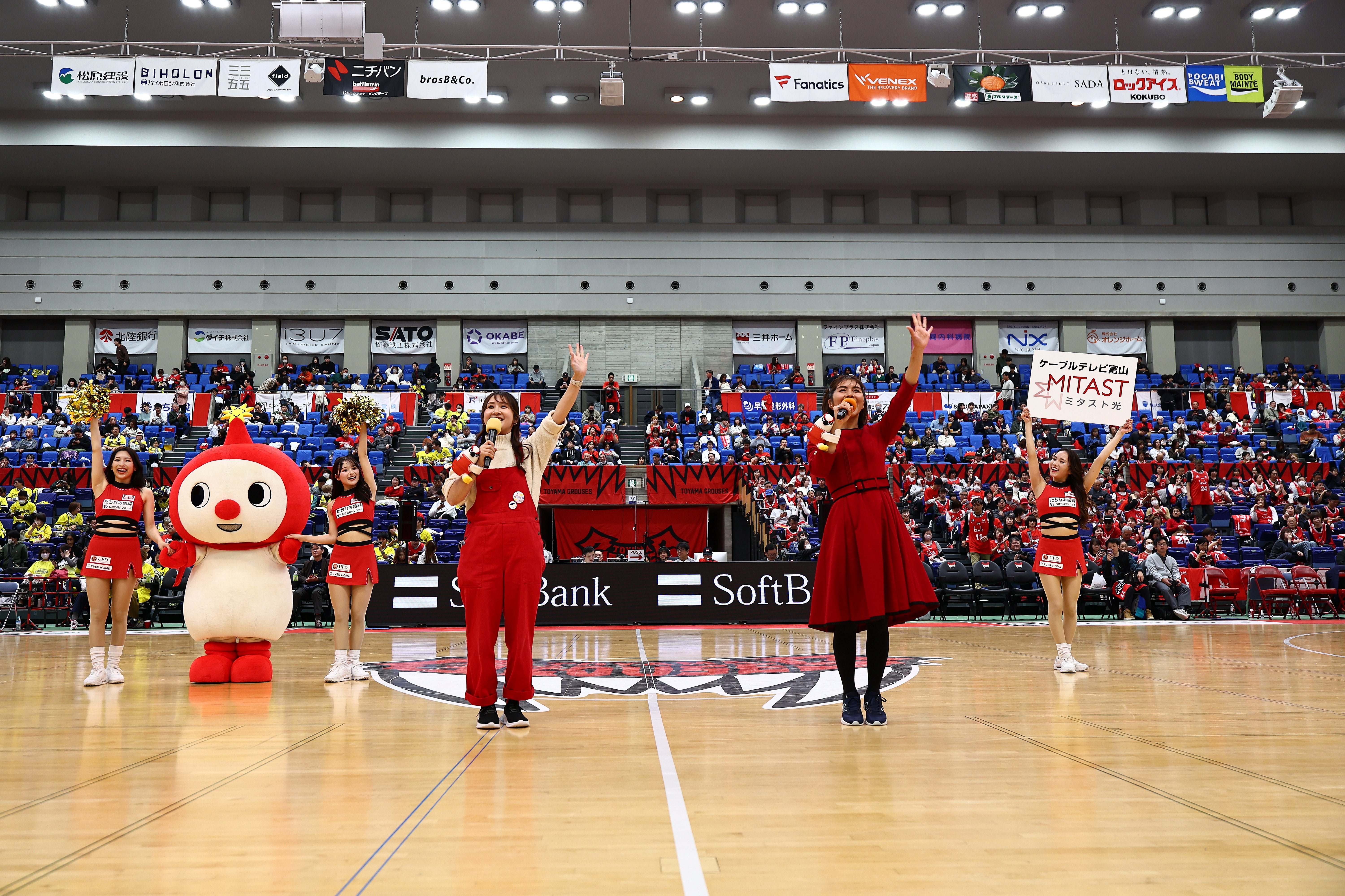ケーブルテレビ富山「Cue!スタジオ」のMCを務める、さだありさ様と新庄結衣様、ケーブルテレビのマスコットキャラクター ミタスト君が来場され、ハーフタイムには番組の耳寄り情報をお届けします!(※写真は2024-25シーズン)■ ミタスト光ケーブルテレビ富山presentsプレゼントタイム!(※26日のみ)