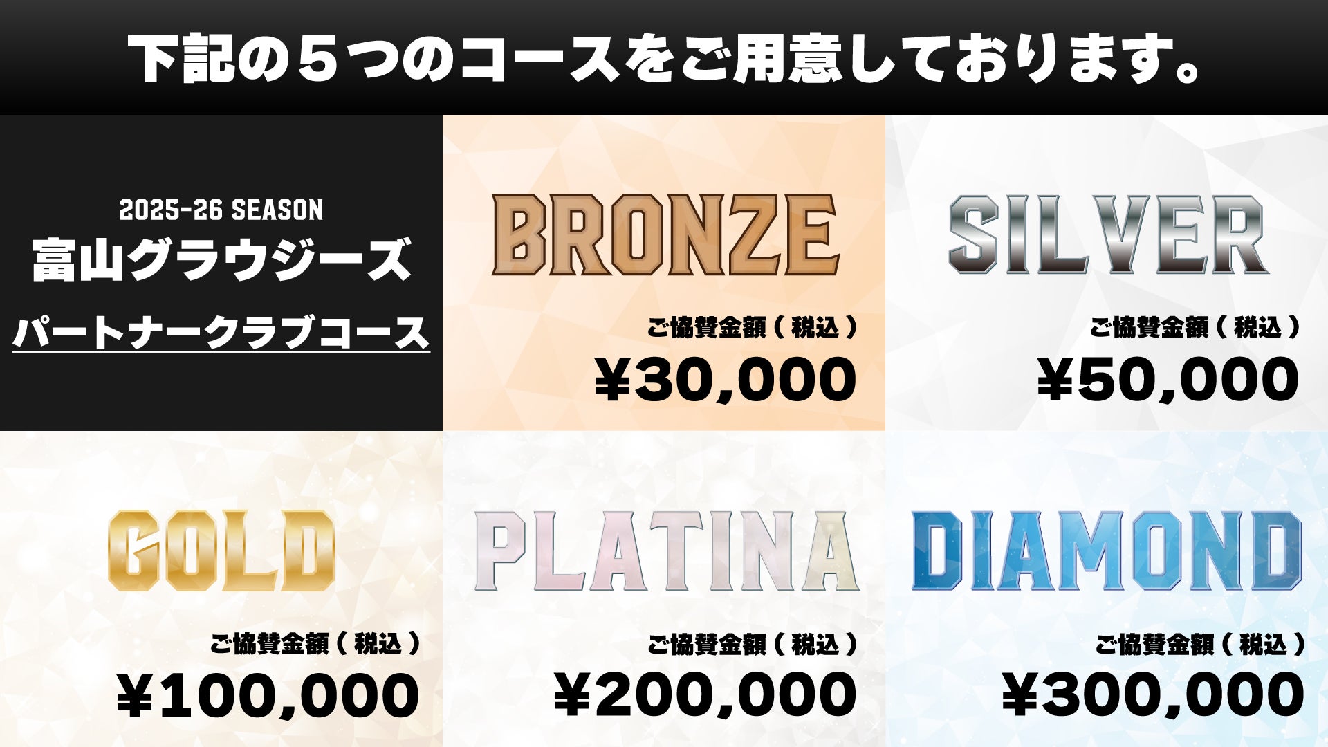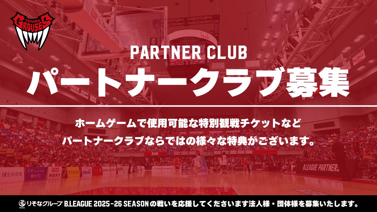 富山グラウジーズでは、「 パートナークラブ 」という呼称のもと、りそなグループ B.LEAGUE 2025-26シーズンの戦いを応援してくださいます法人様・団体様を募集いたします。ホームゲームで使用可能な特別観戦チケットなど、パートナークラブならではの様々な特典がございます。より多くの皆さまと共にシーズンを戦ってまいりたいと考えております。多くのご入会、心よりお待ちしております。